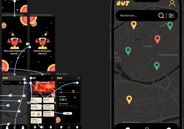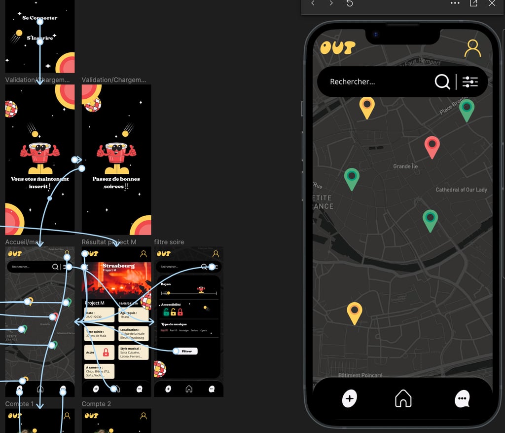 Maquette d'une application visant à connecter les gens, dans notre cas on est partis sur une application de création de soirée. Basée sur une carte sur laquelle apparaît les différentes soirées.